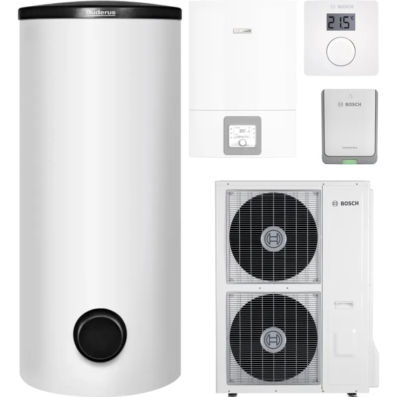 - інструкція, внутрішній блок, зовнішній блок, панель управління, комунікаційний модуль, комплект з кабелем електричним підігрівом конденсату, триходовий зонний клапан, водонагрівач, група безпеки для бойлера