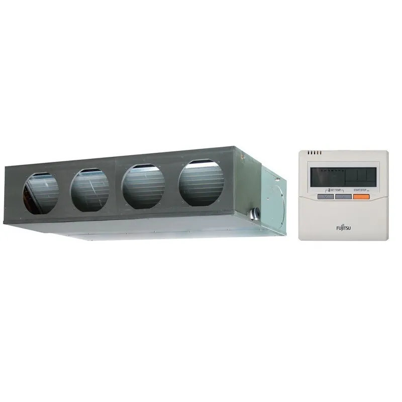 Середньонапірні інверторні канальні моделі ТМ FUJITSU здатні забезпечити комфортний мікроклімат відразу в декількох суміжних приміщеннях одночасно. Завдяки компактним розмірам (всього 270 мм по висоті) вони легко монтуються в просторі за підвісною стелею, що дозволяє таким кондиціонерів вписуватися в найвимогливіший інтер'єр. Охолоджений або нагріте повітря подається в приміщення за системою повітропроводів, які прикріплюються до внутрішнього блоку як при вбудованому, так і при підвісному під стелею монтажі. Інверторна технологія V-PAM гарантує ефективну роботу компресора при високих робочих частотах. Для оптимальної настройки режимів роботи кондиціонера в стандартній комплектації поставляється провідний пульт управління з функцією тижневого таймера.