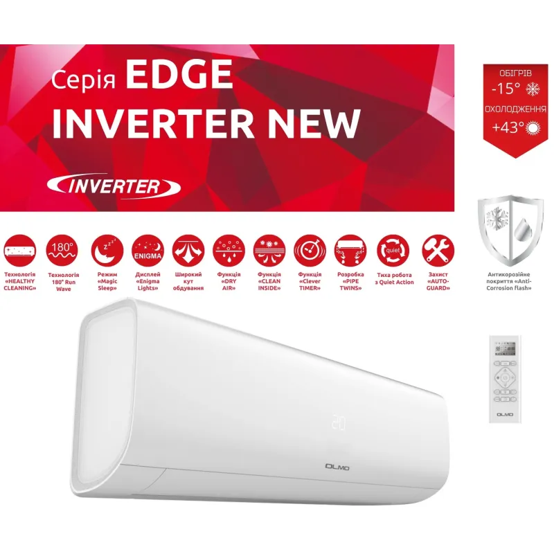 На фото можна оцінити ефектний дизайн внутрішній блок. Доступна ціна кондиціонера спліт-системи Olmo Edge Deluxe Inverter OSH-18FRH3 та продумана конструкція роблять модель популярною. Вона отримала низку особливостей: