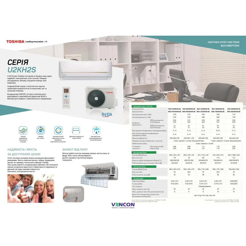 C 2018 року Toshiba поставляє в Україну нову серію надійних і економічних спліт-систем без інвертора. Якість комплектуючих і збірки традиційно високу, як завжди у японського бренду Toshiba. Кондиціонер U2KH2S і все його комплектуючі відповідають європейській Директиві RoHS з безпеки для людини і навколишнього середовища.