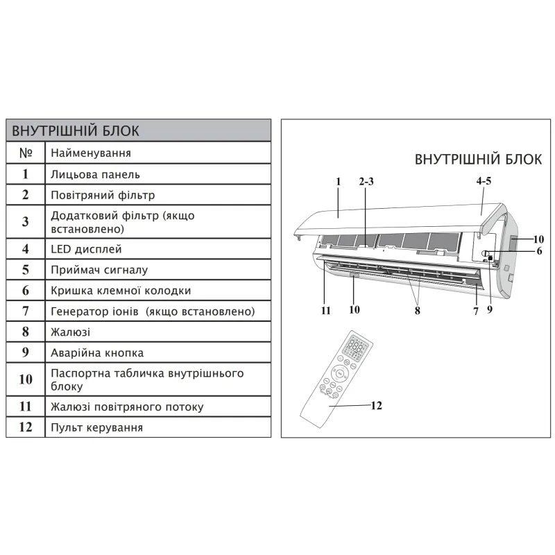 - інструкція, пульт ДУ, внутрішній блок, зовнішній блок, гарантійний талон, батарейки