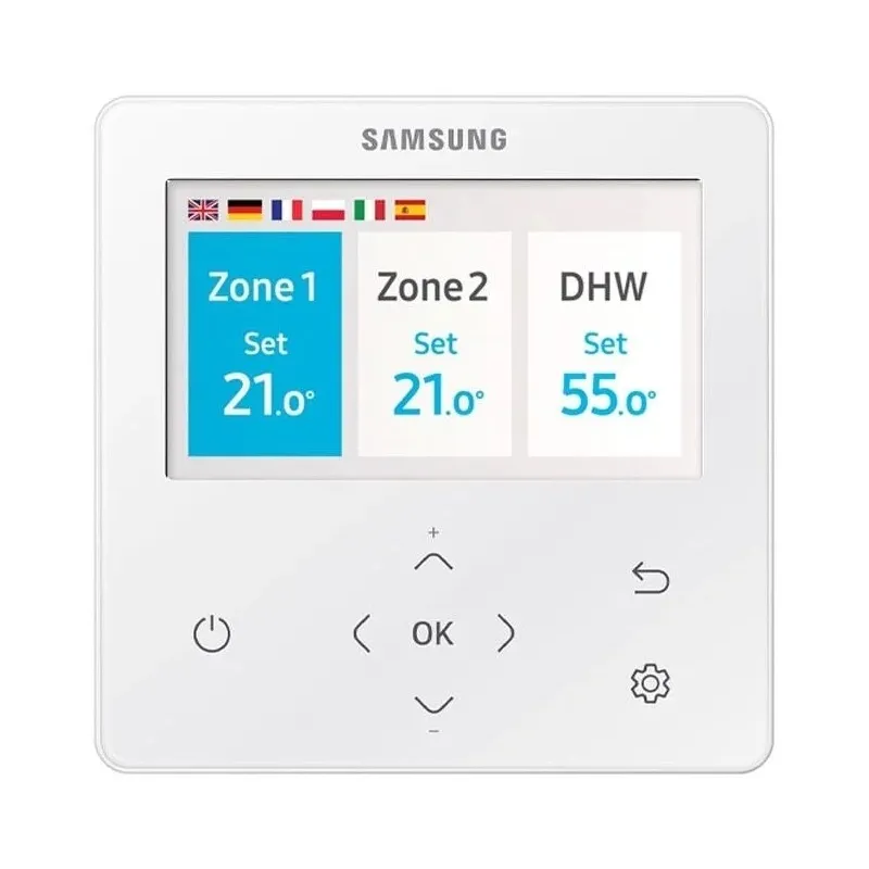 Керування пристроєм з асортименту Climat Expert здійснюється дротовим пультом ДУ з великим дисплеєм. Його інтуїтивний інтерфейс і можливість вибору мови дозволяють комфортно контролювати роботу системи. Завдяки SmartThings і Wi-Fi модулю налаштовувати обладнання можна віддалено. Для цього встановіть на свій девайс застосунок SmartThings.