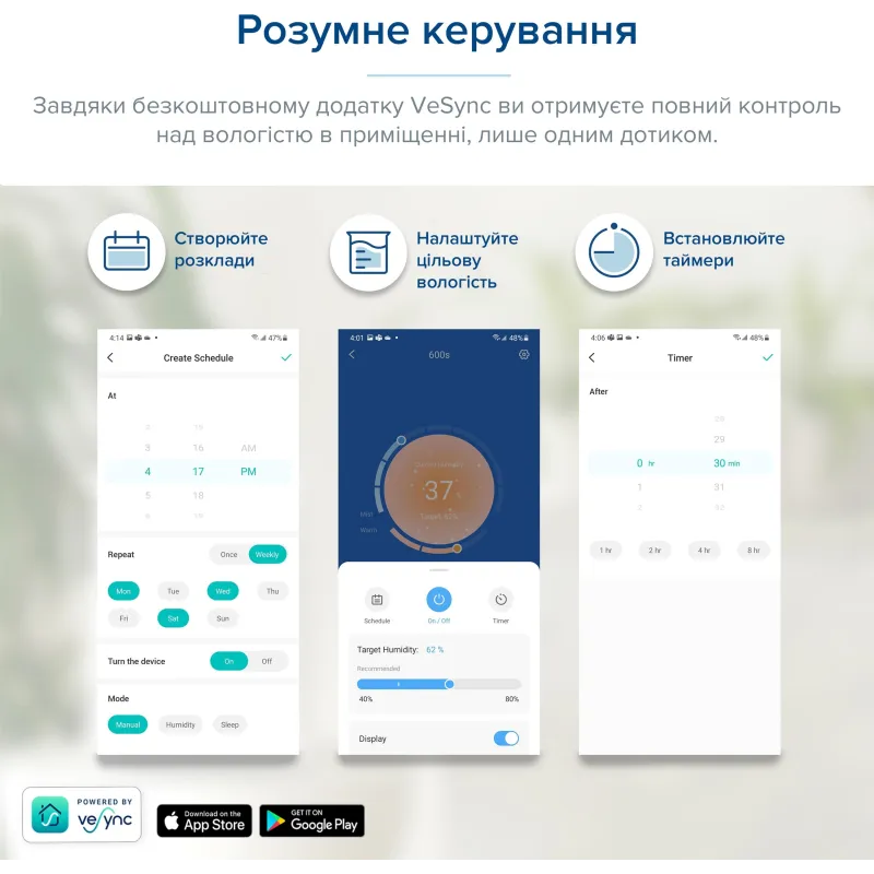 підключіться до мобільного застосунку, щоб виставляти цільовий рівень зволоження, режими, встановлювати таймер тощо.