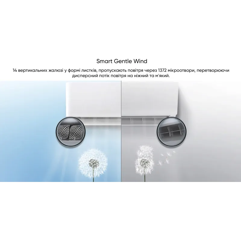 - Smart Gentle Wind - вертикальні жалюзі, що за конфігурацією нагадують листя. Потужний потік повітря проходить через мікроотвори, перетворюючись на більш м'який.