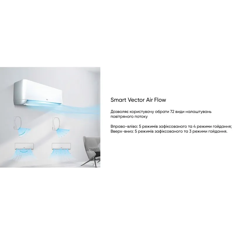 - Smart Vector Air Flow - розумне коригування напрямку повітряних мас. Доступне налаштування 72 векторів під час фіксації та гойдання.