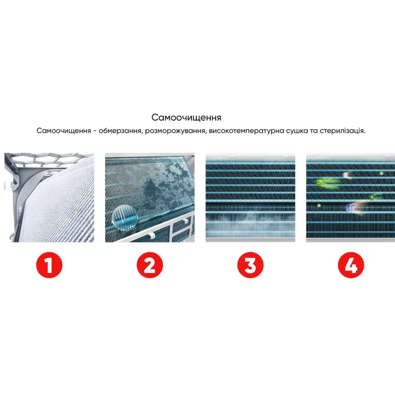 Охолодження повітря виробом від бренду TCL здійснюється без пересушування завдяки оснащенню системою управління холодильним контуром. Вологість зберігається на комфортному рівні. Самоочищення в 4 кроки (від обмерзання до стерилізації) видалить забруднення всередині пристрою.