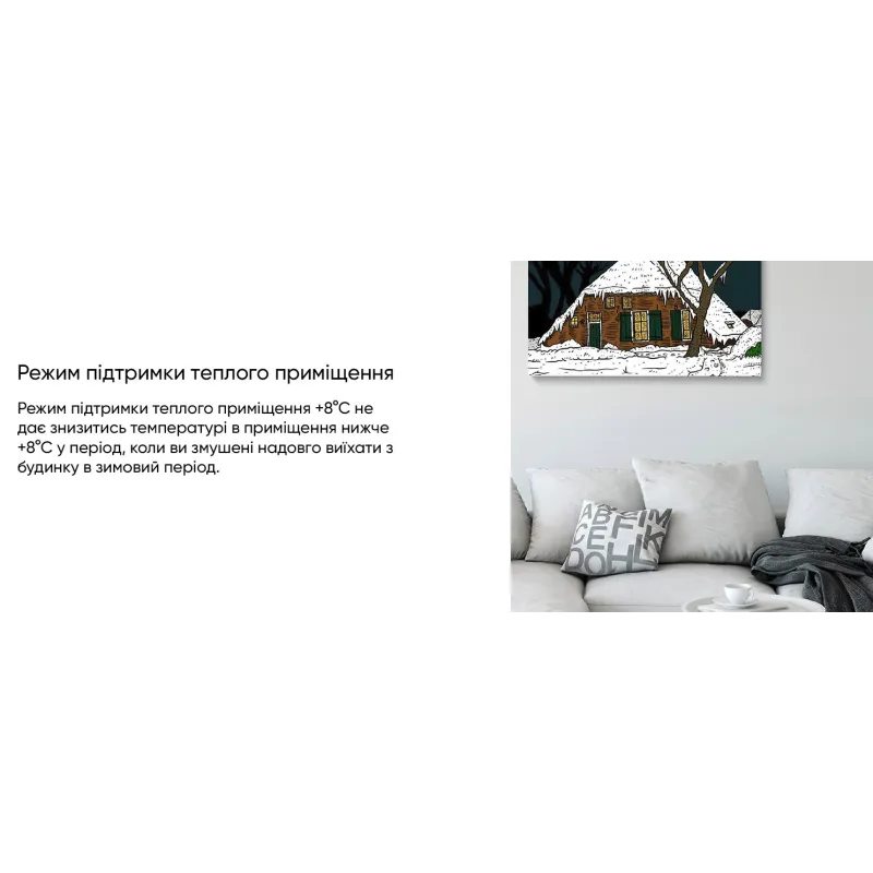 підтримка теплого приміщення в діапазоні щонайменше +8 °C за тривалої відсутності користувача; - AI Algorithm дає змогу швидше виходити на встановлені температурні показники зі збереженням точності.