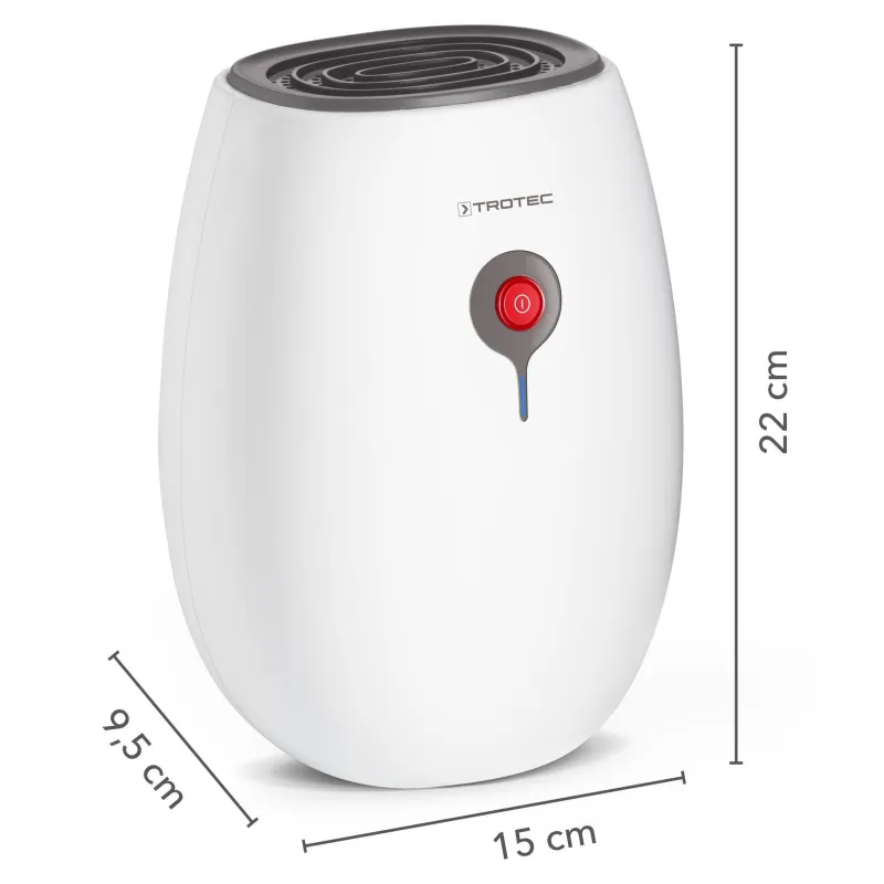 Trotec TTP 2 E — компактний осушувач повітря, який підходить для боротьби з високою вологістю навіть у дитячих кімнатах, оскільки не займає багато місця та не заважає сну. Підлогова модель білого кольору оснащена червоною кнопкою увімкнення/вимкнення. Якщо ви вирішите купити осушувач повітря Trotec TTP 2 E, він буде працювати за принципом конденсації, а краплі води стікатимуть у спеціальний резервуар, який легко дістається для спустошення. Родзинкою пристрою стало використання елемента Пельтьє, завдяки чому можна обійтися без холодоагенту та компресора.