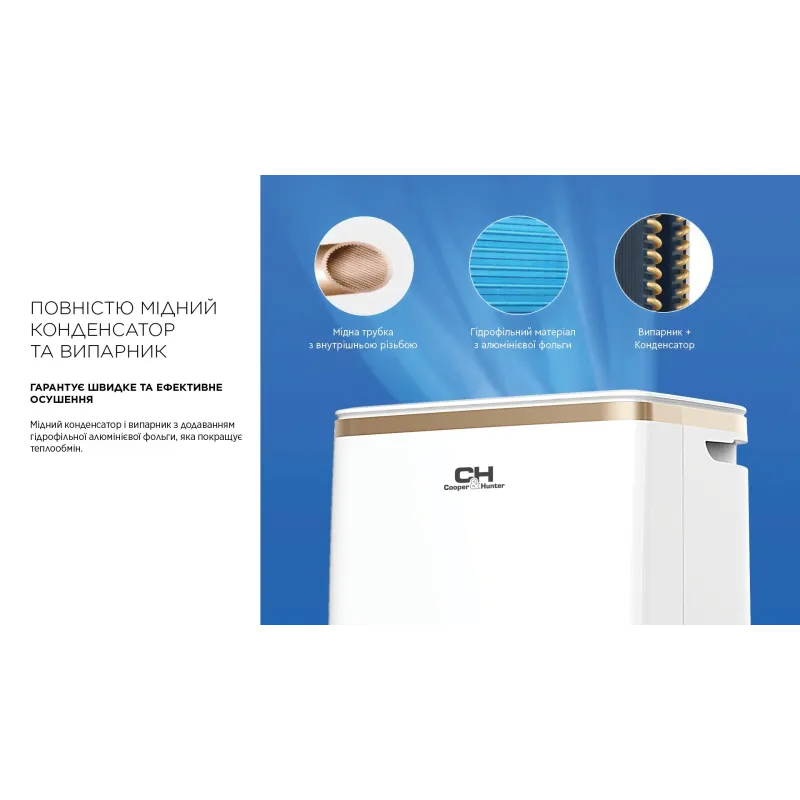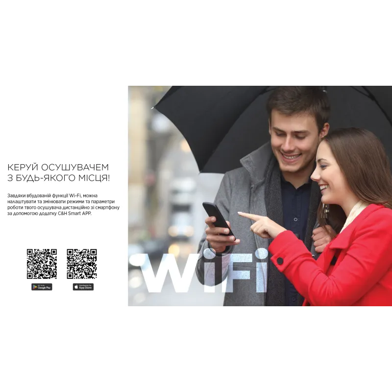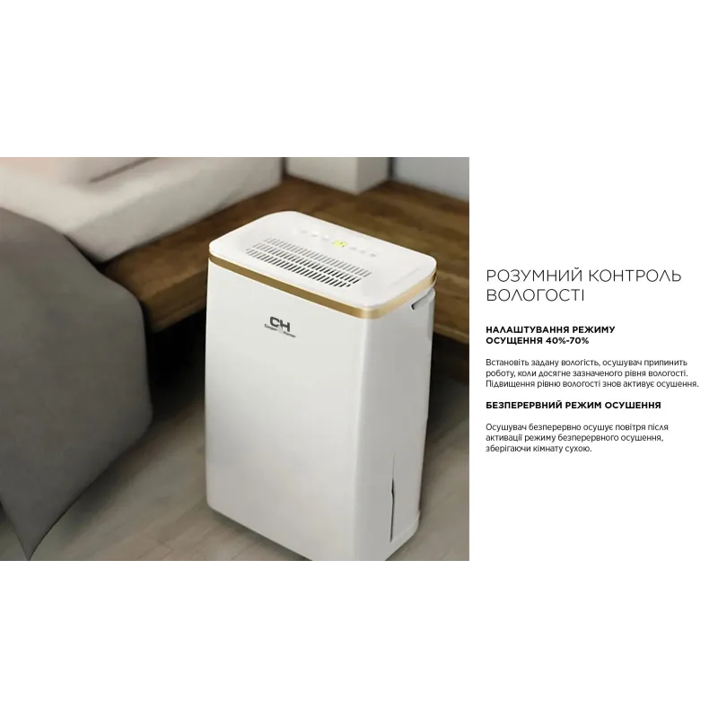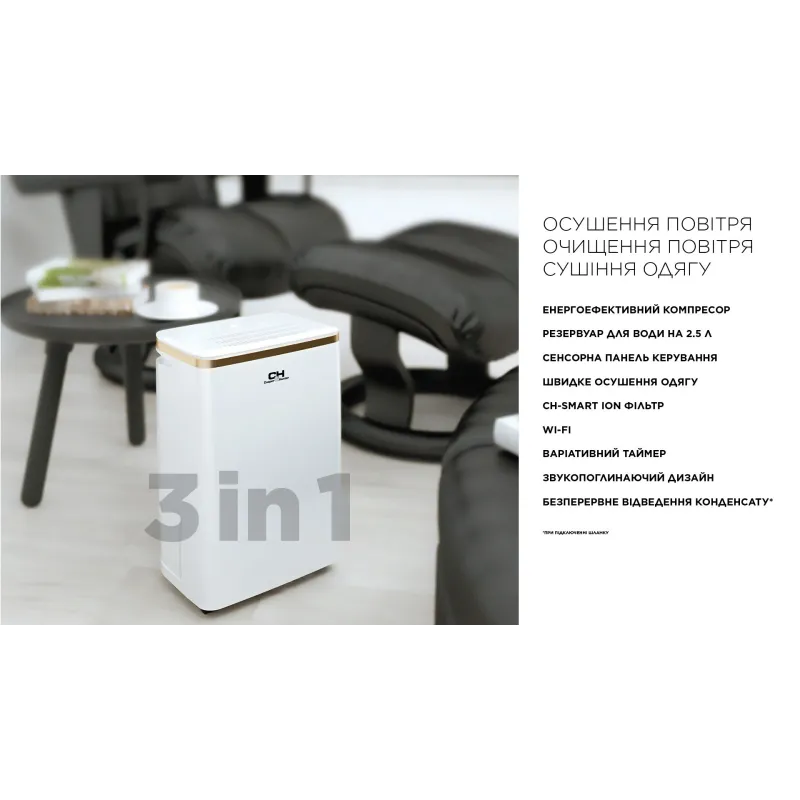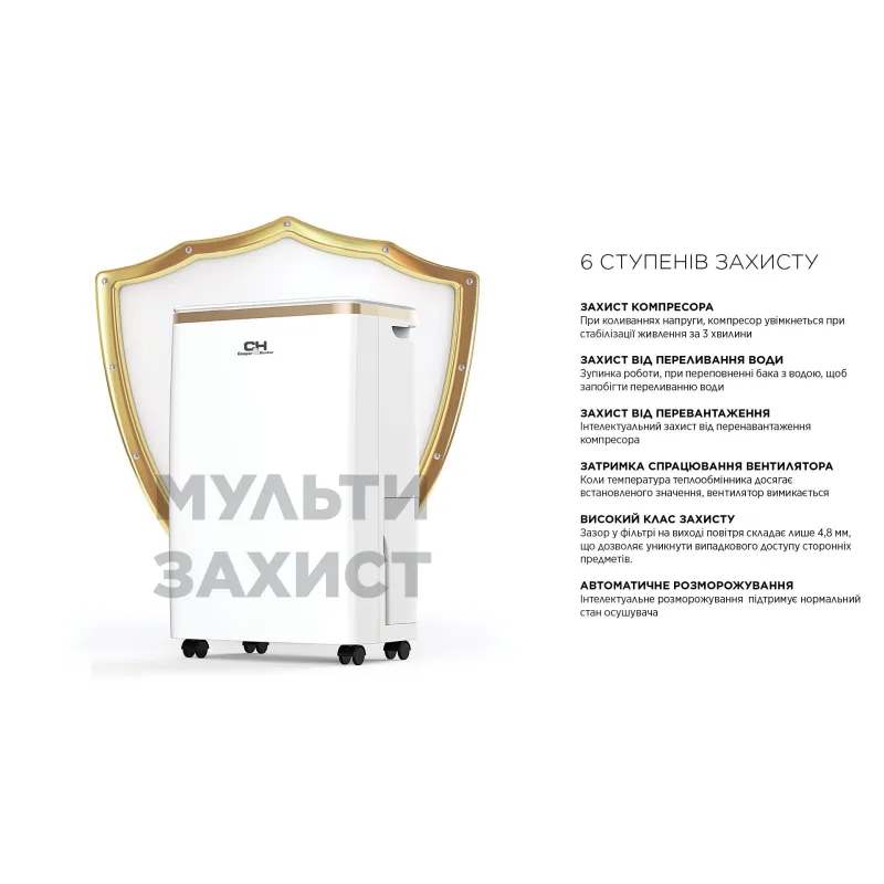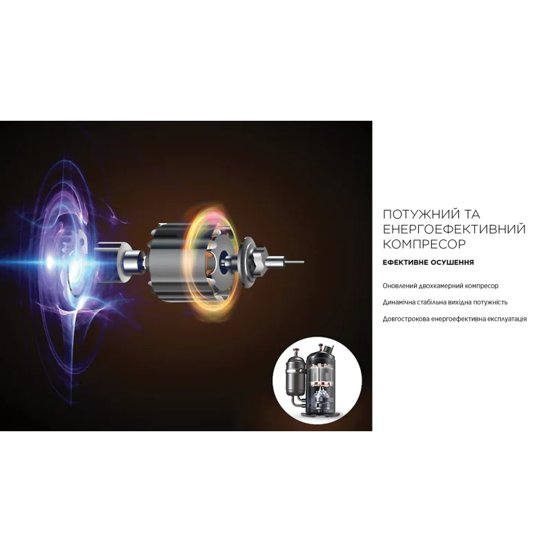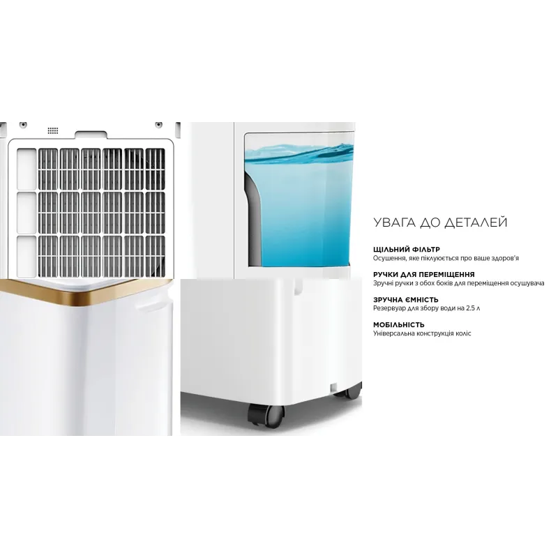 - ручка для перенесення, таймер, дисплей, індикатор заповненості резервуара для конденсату, індикатор забруднення фільтра, авторозморожування, захист від перевантаження, захист від переповнення, wi-fi управління, іонізація повітря