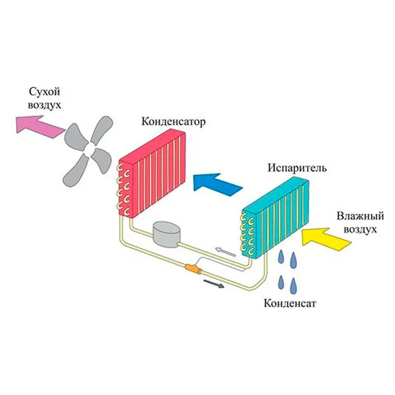 Вентилятор забирає повітря з приміщення з надлишковою вологістю і подає на випарник (радіатор з низькою температурою). При попаданні на даний випарник, повітря сильно охолоджується, а надмірна волога з повітря конденсується і стікає в резервуар для води. Після, вже осушене повітря надходить на конденсатор (радіатор з високою температурою). Нагрітий і осушене повітря подається в приміщення.