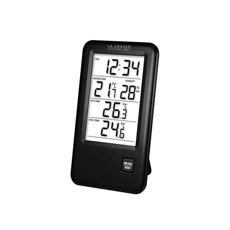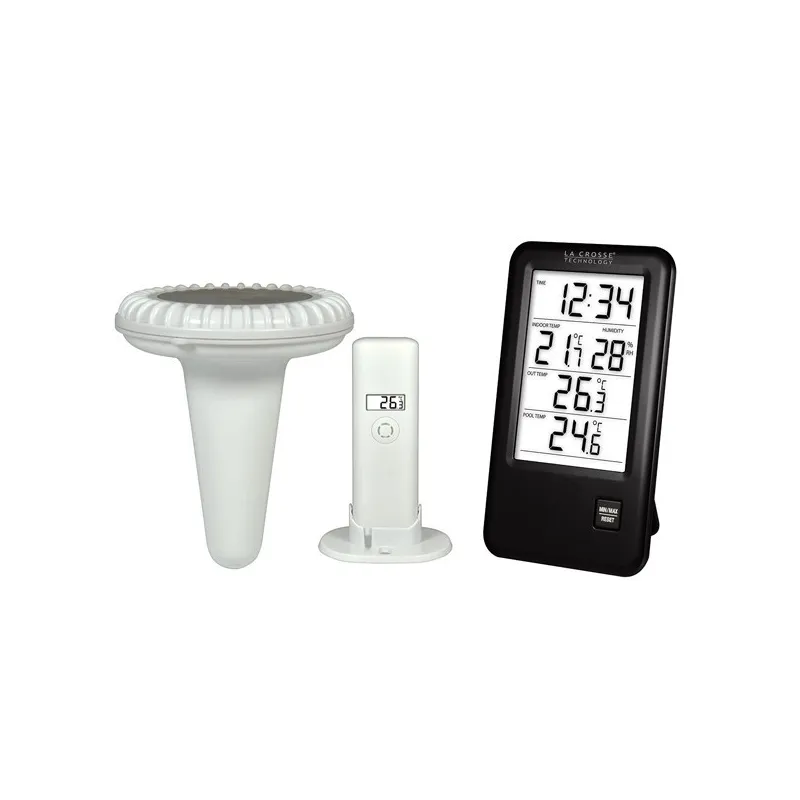 Метеостанція La Crosse WS9068IT-BLA вимірює температуру і вологість в приміщенні, температуру повітря зовні приміщення, а завдяки додатковому термодатчику-поплавця, вимірює температуру води в басейні.