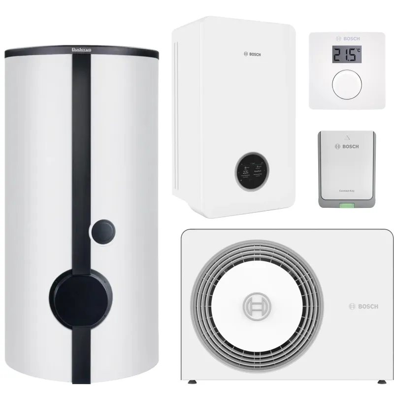 - инструкция, внутренний блок, наружный блок, панель управления, коммуникационный модуль, комплект с кабелем электрическим подогревом конденсата, водонагреватель, группа безопасности для бойлера, датчик температуры