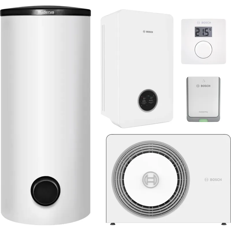 - инструкция, внутренний блок, наружный блок, панель управления, коммуникационный модуль, комплект с кабелем электрическим подогревом конденсата, водонагреватель, группа безопасности для бойлера, датчик температуры
