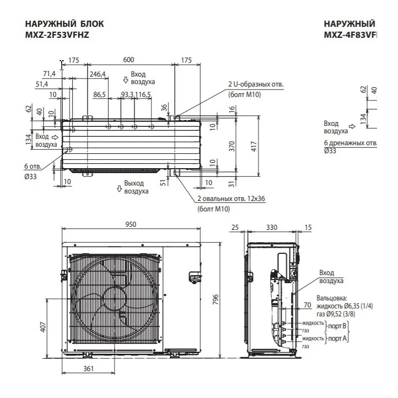 - Диаметр труб (жидкость / газ)