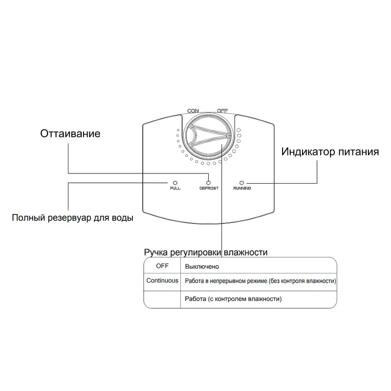 - збирання конденсату в бак, авторозморожування, вбудований гігростат, автовідключення при заповненні контейнера, дренаж, індикатор вологості